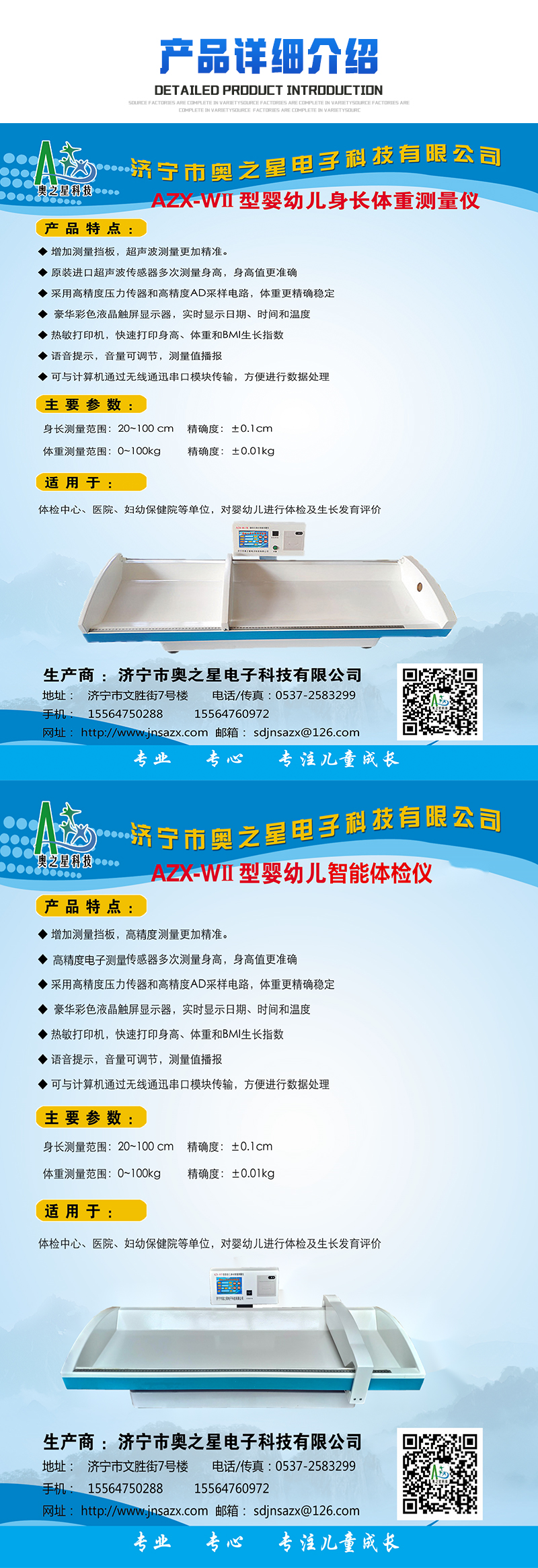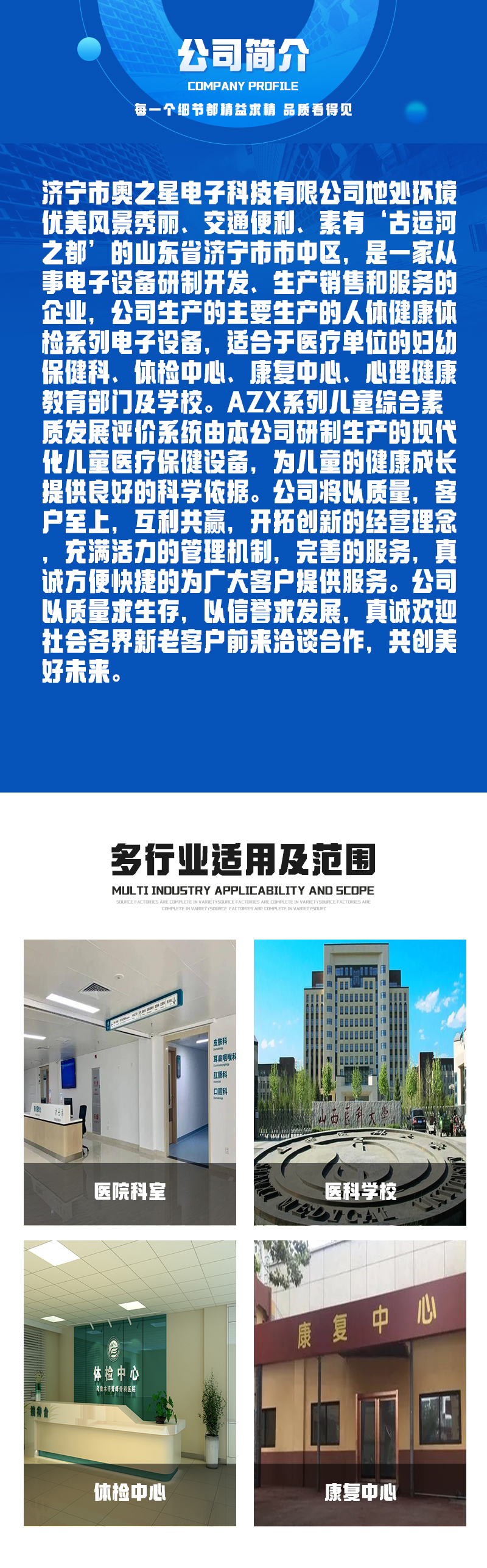 | 公司简介 | 济宁市奥之星电子科技有限公司地处环境优美风景秀丽、交通便利、素有‘古运河之都’的山东省济宁市市中区,是一家专业从事电子设备研制开发、生产销售和服务的企业,公司生产的人体健康体检系列电子设备,适合于医疗单位的妇幼保健科、体检中心、康复中心、心理健康教育部门及学校。AZX系列儿童综合素质发展评价系统由本公司研制生产的现代化儿童医疗保健设备,为儿童的健康成长提供良好的科学依据。公司将以质量第一,客户至上 ... | ||