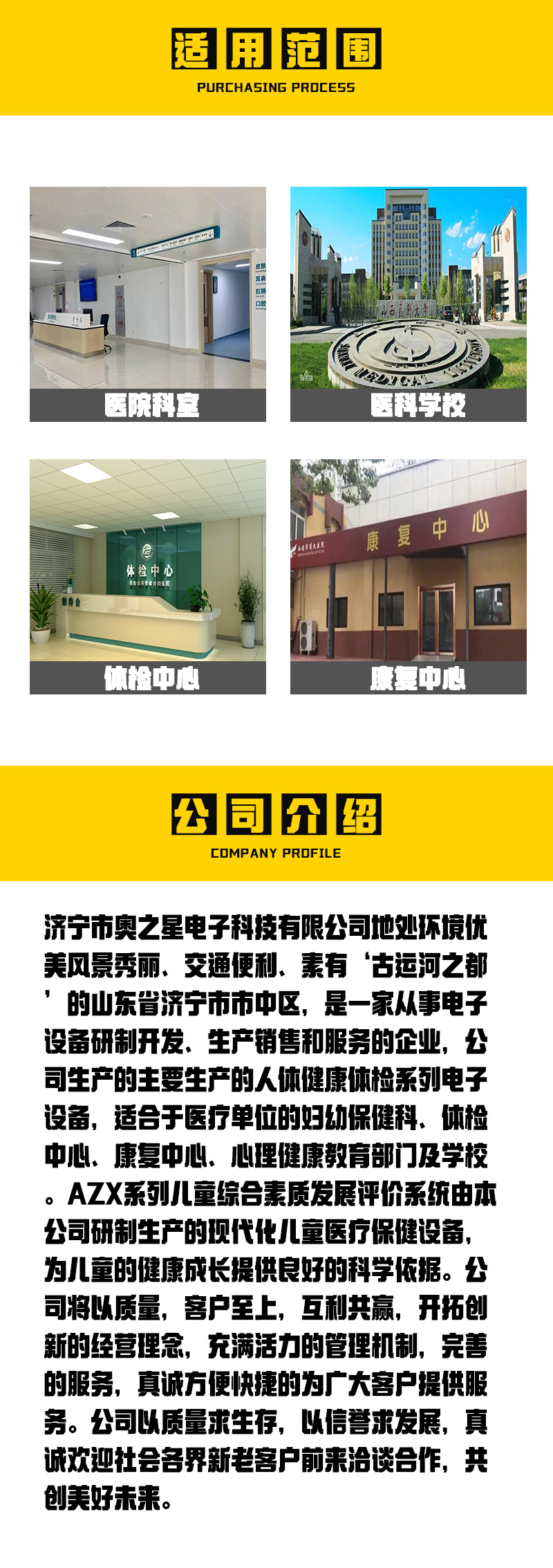| 公司简介 | 济宁市奥之星电子科技有限公司地处环境优美风景秀丽、交通便利、素有‘古运河之都’的山东省济宁市市中区,是一家专业从事电子设备研制开发、生产销售和服务的企业,公司生产的人体健康体检系列电子设备,适合于医疗单位的妇幼保健科、体检中心、康复中心、心理健康教育部门及学校。AZX系列儿童综合素质发展评价系统由本公司研制生产的现代化儿童医疗保健设备,为儿童的健康成长提供良好的科学依据。公司将以质量第一,客户至上 ... | ||