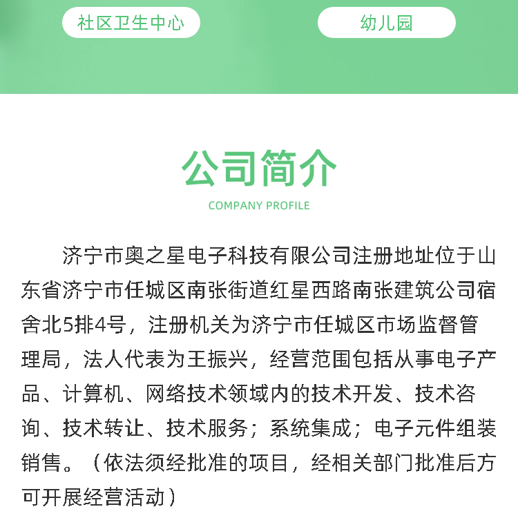 | 公司简介 | 济宁市奥之星电子科技有限公司地处环境优美风景秀丽、交通便利、素有‘古运河之都’的山东省济宁市市中区,是一家专业从事电子设备研制开发、生产销售和服务的企业,公司生产的人体健康体检系列电子设备,适合于医疗单位的妇幼保健科、体检中心、康复中心、心理健康教育部门及学校。AZX系列儿童综合素质发展评价系统由本公司研制生产的现代化儿童医疗保健设备,为儿童的健康成长提供良好的科学依据。公司将以质量第一,客户至上 ... | ||