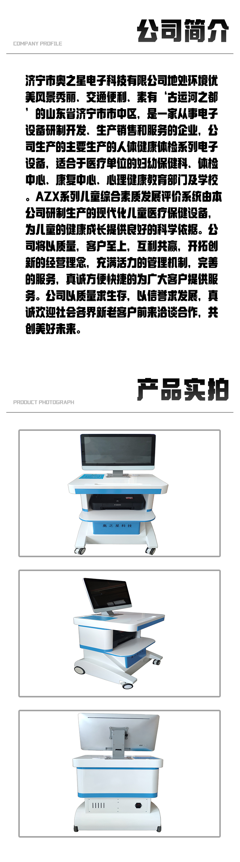 | 公司简介 | 济宁市奥之星电子科技有限公司地处环境优美风景秀丽、交通便利、素有‘古运河之都’的山东省济宁市市中区,是一家专业从事电子设备研制开发、生产销售和服务的企业,公司生产的人体健康体检系列电子设备,适合于医疗单位的妇幼保健科、体检中心、康复中心、心理健康教育部门及学校。AZX系列儿童综合素质发展评价系统由本公司研制生产的现代化儿童医疗保健设备,为儿童的健康成长提供良好的科学依据。公司将以质量第一,客户至上 ... | ||