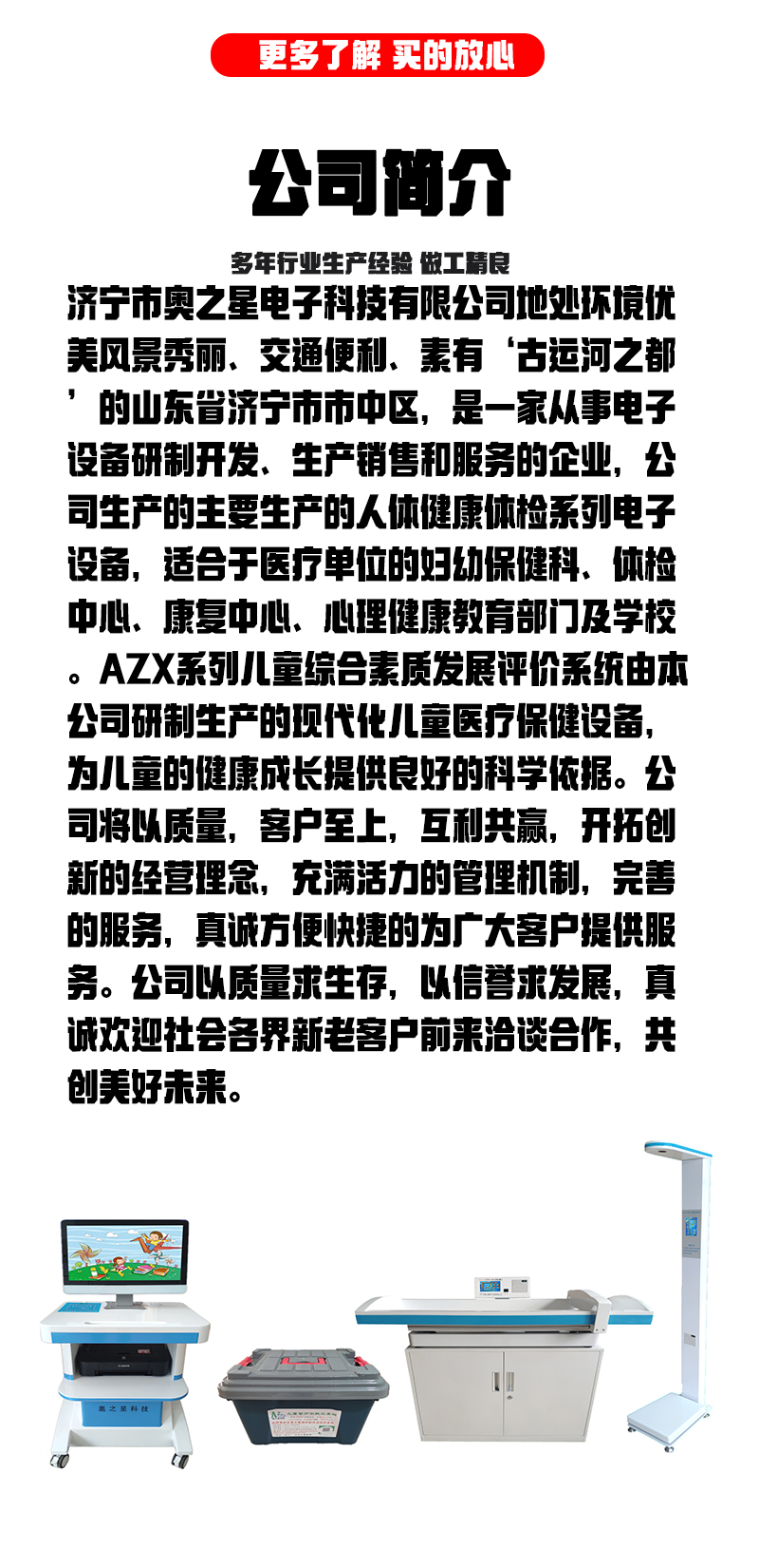 | 公司简介 | 济宁市奥之星电子科技有限公司地处环境优美风景秀丽、交通便利、素有‘古运河之都’的山东省济宁市市中区,是一家专业从事电子设备研制开发、生产销售和服务的企业,公司生产的人体健康体检系列电子设备,适合于医疗单位的妇幼保健科、体检中心、康复中心、心理健康教育部门及学校。AZX系列儿童综合素质发展评价系统由本公司研制生产的现代化儿童医疗保健设备,为儿童的健康成长提供良好的科学依据。公司将以质量第一,客户至上 ... | ||